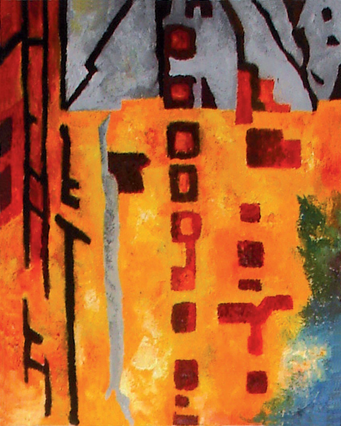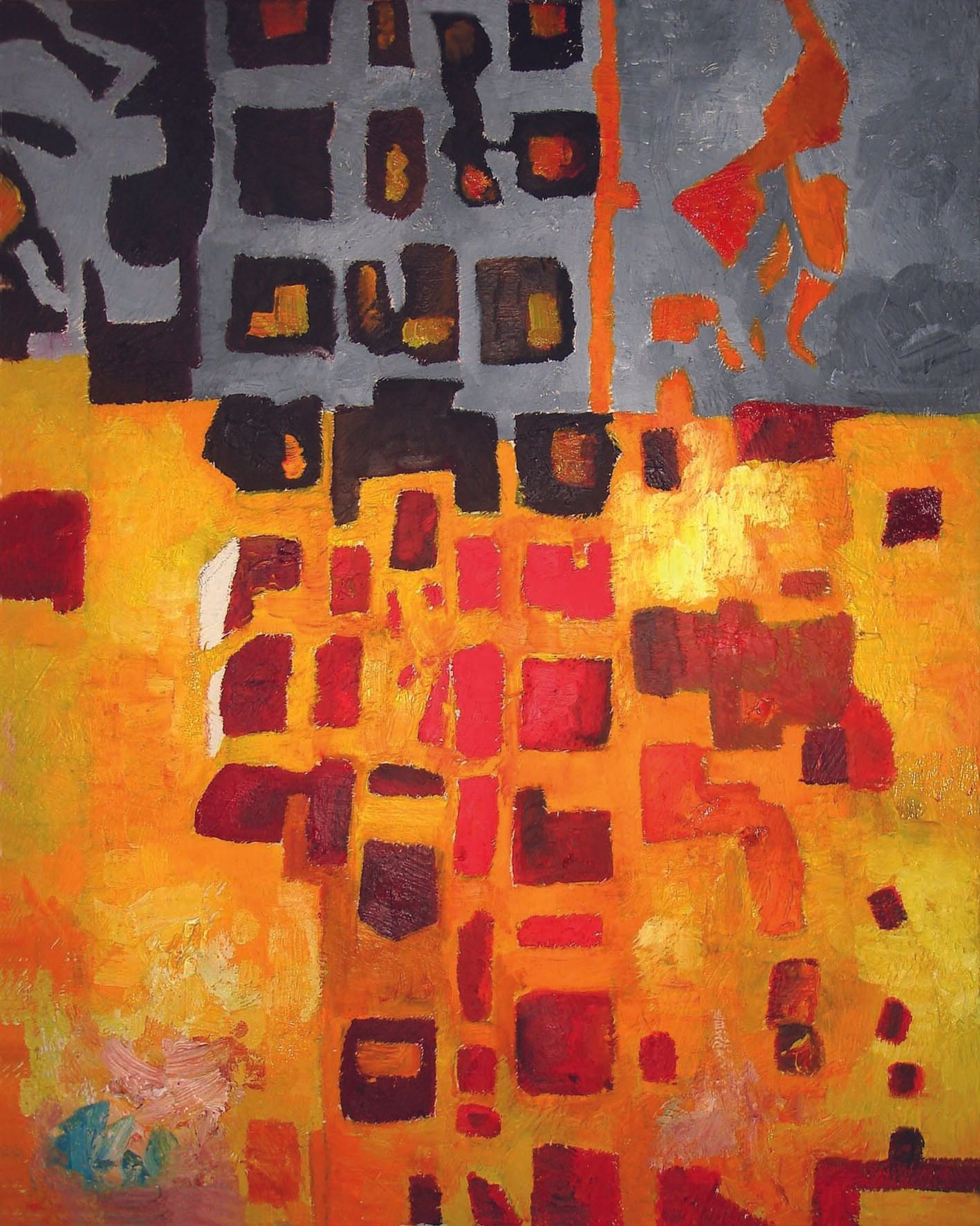 civilisation occidentale (Paris ?, New York ?), une ville « tentaculaire », éclairée par une lumière violente üaune et rouge flamme, évocatrice du feu) qui s'impose sur les formes grises des gratte-ciels aux mille fenêtres.