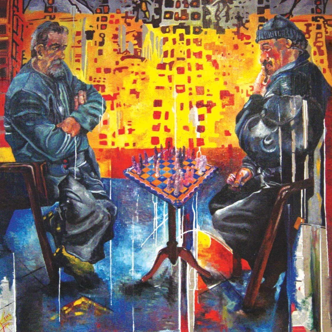 La grande toile centrale (carrée) représente deux joueurs d'échecs s'affrontant dans la partie dite « immortelle », une partie qui n'aura pas de vainqueurs. La scène s'encadre dans un décor mi-figuratif mi-abstrait, où les surfaces de couleurs (gris, jaune, rouge) viennent suggérer la représentation d'une ville contemporaine de la
