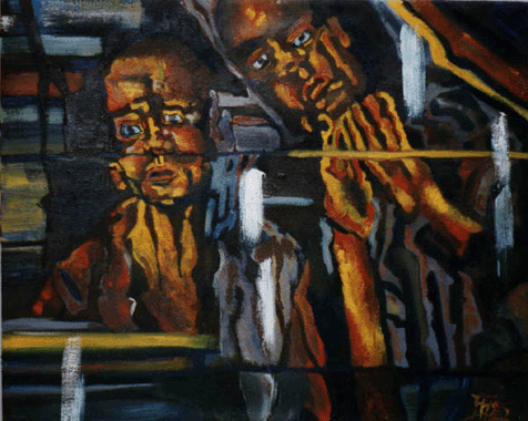 L’ensemble des travaux composant la série forme la structure d’une croix latine. Cette macrostructure est le symbole de la souffrance, voire même de la corporalité de la souffrance, mais aussi d'une renaissance après la mort. Toutes les scènes qui composent la série renvoient sans cesse à ce symbole. Il s'agit en effet d'une multiplicité de figures de la souffrance, humaine et même corporelle, sacralisée dans le mystère de la mort. La répétition, qui est à la base de la notion même de la série, veut ici suggérer l'idée du cycle, du passage perpétuel de la vie à la mort. Crucifissione représente quatre aspects de la vie côtoyant la mort, des visages de moins en moins humains, car de plus en plus possédés par l’absence. Autant d’images que la mémoire a pu fixer des images venant de l’immense tragédie de l’Holocauste. Il s’agit d’images cristallisées, comme sauvées dans le mouvement infini du Temps et de l’Histoire. Des images fixées dans la recherche d’un sens. Chaque figure fait l'objet d'une série de quatre techniques différentes : un dessin, une gouache dichromatique, une gouache polychrome, une huile sur toile. Dans chacune des représentations l'homme apparaît comme derrière un écran ; au premier plan des bandes de couleur horizontales sembleraient évoquer des barbelés. Autant de références à l'actualité et à l’histoire : la souffrance que l'on regarde à distance, derrière le filtre de l'information ou de la mémoire historique, tandis que le scandale de la tragédie concentrationnaire se répète dans l'histoire des hommes.