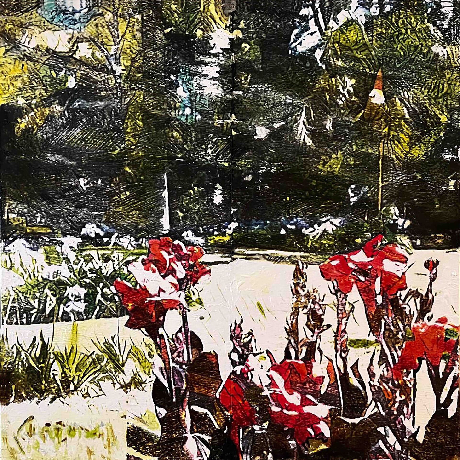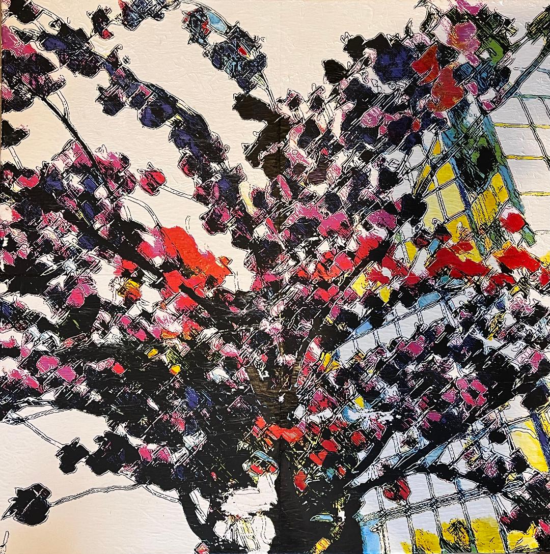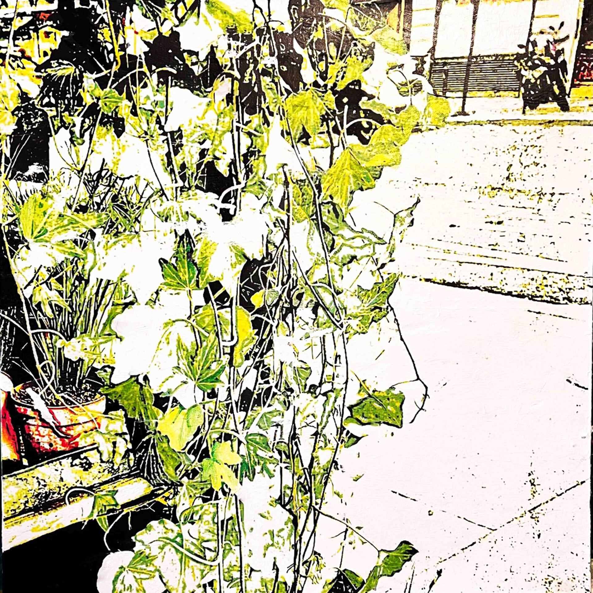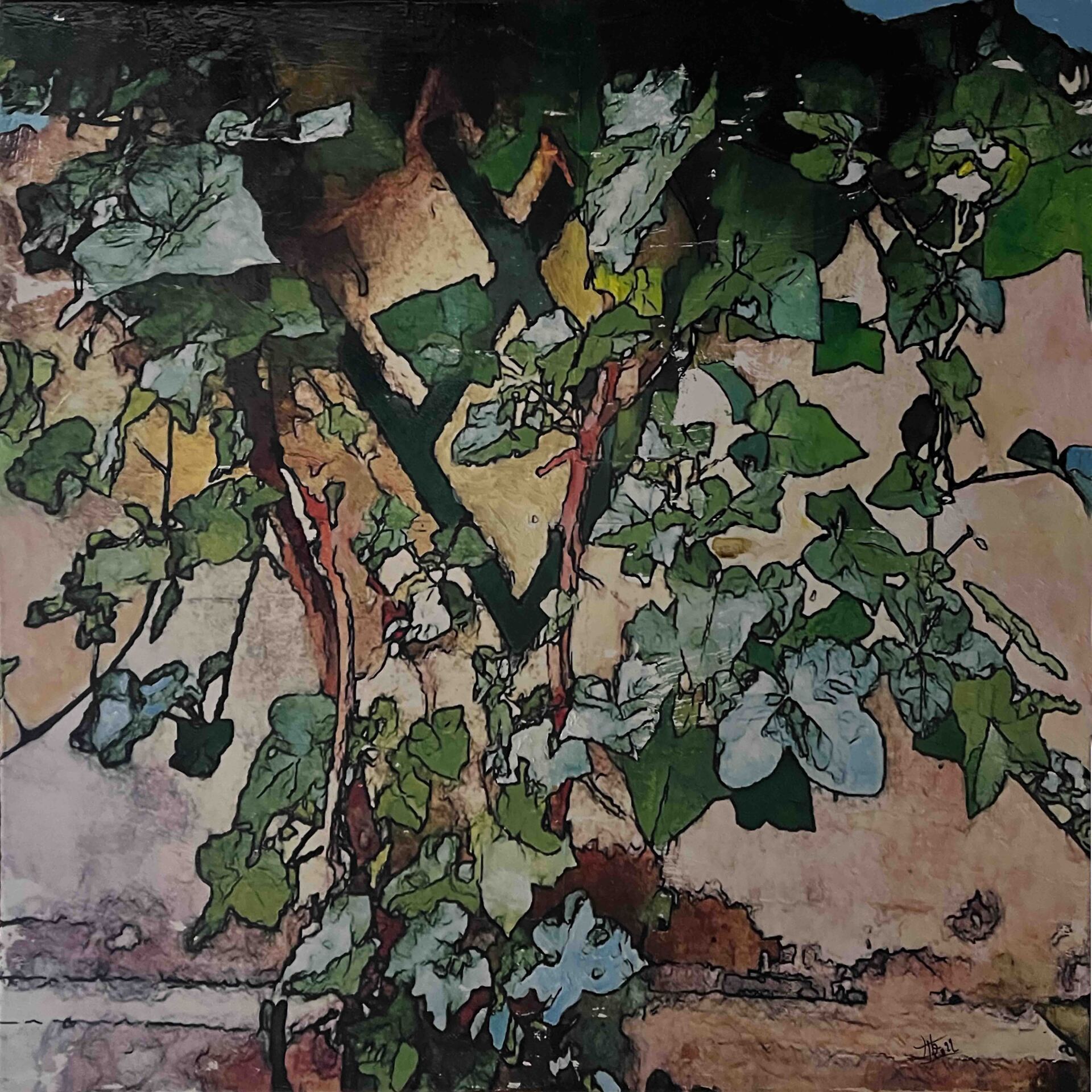 En travaillant ma série Abstractions végétales j’ai voulu partir d’éléments du monde végétal pour arriver à des formes lesquelles, regardées à distance ou dans l’ensemble de la composition, deviennent abstraites. Les plantes grimpantes ou rampantes, le lierre, la mauvaise herbe, les ronces, le chiendent, le pissenlit, le chardon et le liseron des champs envahissent insidieusement l’espace, par la douceur ou de manière agressive, avec des froissures, des heurts, des entrelacements, des accolements, des fêlures, et font glisser les figures peintes vers l’abstrait.